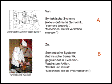& Cognition v. Hans-Georg Stork* Was haben Content und Cognition, "Digital Content" und "Cognitive Systems" miteinander zu tun ? Eine ganze Menge, so behaupte ich, wenn wir uns auf ein geeignetes Verstaendnis der Begriffe einigen. Zunaechst "Content". Das deutsche Wort, "Inhalt", deckt leider nicht das ganze breite Spektrum ab, welches sich hinter der englischen Vokabel verbirgt. Diese bezeichnet, kurz gesagt, die externen und kommunizierbaren Repraesentationen, die wir Menschen von unseren Wahrnehmungen und Gedanken anfertigen koennen. Die besondere Auspraegung dieser Faehigkeit unterscheidet uns von so ziemlich allen anderen Lebewesen auf der Erde. Hier sind ein paar Beispiele: ![]() Natuerlich fallen diese externen Repraesentationen nicht vom Himmel ("out of the blue"): ![]() Vielmehr steckt dahinter die in Jahrmillionen entwickelte und ueber ihre jeweilige Lebenszeit gewachsene Materie und Struktur unserer Physis. Und darin, vor allem, das aus ca. 100 Milliarden Neuronen und etwa 10000-mal so vielen Synapsen bestehende zentrale Kontrollorgan, das Gehirn: ![]() "Content" ergibt sich damit aus unserem durch das Gehirn vermittelte und reflektierte Erkennen und Erleben der Welt. ![]() Die diesem zugrundeliegenden Vorgaenge wollen wir "Cognition" nennen. Tatsaechlich ist die Schaffung von "Content" eine der wichtigsten Weisen menschlichen Wirkens in der Welt. Ja, der von uns geschaffene "Content" wird zu einem festen Bestandteil der Welt, wie sich jedermann leicht ueberzeugen kann, der durch die Strassen geht oder auf's Buecherregal oder in die Fernsehroehre schaut. ![]() Und somit selbst zum Gegenstand von Perzeption und Reflektion, von Kognition also. Das kann auf die Dauer - Stichwort “Informations-Überflutung” - ziemlich anstrengend sein. Aber gluecklicherweise erfahren wir seit geraumer Zeit zumindest potentiell Unterstuetzung bei unserem Bemuehen, sowohl die urspruengliche Sinneswelt als auch die von uns selbst geschaffenen kuenstlichen Welten zu verstehen und zu verarbeiten, und zwar etwa so: ![]() Damit sind wir bei "Digital Content" und "Cognitive Systems" angelangt, oder wenigstens doch bei Systemen, welche unserer eigenen Kognition dienlich sind oder es doch sein sollten. Wir koennten von solchen Systemen, wenn wir sie auf die Analyse von “Digital Content” abrichten, zum Beispiel verlangen, dass sie diesen kategorisieren und uns verstaendliche Beschreibungen dessen liefern, was sie auf einem Bild “sehen". ![]() Allerdings, ausser durch die Erzeugung von “Content” zeigen sich unsere kognitiven Faehigkeiten ganz allgemein in Aktionen, welche eine Veraenderung unserer Lebensbedingungen bewirken oder diese gar ausdruecklich zum Ziel haben. ![]() Und es ist an dieser Stelle durchaus opportun zu bemerken, dass wir damit im Tierreich keineswegs allein stehen. ![]() Wir Menschen haben, anders als die allermeisten Tiere, gezielt und bewusst hergestellte Maschinen und andere technische Systeme, die uns auch bei unseren vielfaeltigen "handfesten" Aktionen in der Welt unserer fuenf Sinne helfen. Doch koennten diese Systeme in vieler Hinsicht viel besser sein, als sie es heute schon sind. Zum Beispiel koennten sie uns, gewissermassen in eigener Regie (“autonom”), einen Grossteil der "kognitiven Last" abnehmen, die mit der Bewaeltigung der ihnen gestellten Aufgaben verbunden ist. Stattdessen muessen sie, im Grossen und Ganzen, alles auf unser Kommando und unter unserer Kontrolle tun. Autonome Maschinen zu bauen, ist ein uralter Traum der Menschen. Eine moegliche Inkarnation ist seit einigen Jahrzehnten unter anderem unter dem Begriff "Roboter" gelaeufig. Deren populaerste Vertreter haben gar, wie sollte es anders sein, menschliche Gestalt. Frankenstein und Golem lassen gruessen ... ![]() Und hier ist eine ganze Menagerie … deren Nachfahren des Jahres 2050 den (menschlichen!) Fussballweltmeister besiegen sollen. ![]() Aber es gibt auch solche, bei denen offenbar nicht-menschliche Lebewesen Pate gestanden haben: ![]() All diese Maschinen und Systeme sollen keine Schachaufgaben und keine anderen klassischen Probleme der “Kuenstlichen Intelligenz” loesen und auch keinen Lagerbestand optimal kontrollieren. Aber sie muessen "ihre Sinne" beisammen haben, zum Beispiel, wenn es darum geht, einen bestimmten Gegenstand auch dann wiederzuerkennen, wenn dieser unter ganz anderem Blickwinkel, in ganz anderem Licht erscheint. Fuer andere Systeme ist es wuenschenswert, dass sie gesprochene Sprache und deren Sprecher auch vor lautem Hintergrundgeraeusch identifizieren koennen. Alle aber sollten etwas von ihrer Umwelt verstehen (wozu auch die dort gesprochene Sprache gehoeren kann), das heisst, sie sollten ihre Aktionen auf der Bedeutung dessen gruenden, das diese Aktionen erlaubt. Zum Beispiel sollten sie erkennen, wozu der Griff am Becher, eine Geschirrspuelmaschine, oder ein Buergersteig "gut sind", was sie damit machen koennen ("affordances"). ![]() In diesem Sinne kognitive Maschinen und Systeme muessen also nicht notwendigerweise auf der Hoehe der hoechsten menschlichen Intelligenz sein oder gar – wie wir – ein ausgeprägtes Bewusstsein haben. Was sie tun sollten, das koennen auch viele Tiere, Lebewesen also, denen weit weniger Gehirnschmalz zur Verfuegung steht, als uns Menschen. Und wir wissen noch nicht einmal, wie Tiere ihre vielfaeltigen Leistungen erbringen. Welche Ueberlegungen liegen dem EU Programm "Cognitive Systems" zugrunde und welche Ziele verfolgt es ? Vielen klugen Leuten, die auf diesem Gebiet arbeiten, ist es seit geraumer Zeit ziemlich klar, dass es neuer Ansaetze bedarf, um Maschinen und Systeme der eben beschriebenen Art herzustellen. Ansaetze, die ein gutes Stueck ueber das hinaus gehen, was wir gemeinhin unter “Good Old Fashioned Artificial Intelligence” (GOFAI) verstehen. Diese wird gern etwas polemisch durch die auf John Searle zurueckgehende Metapher des “Chinesischen Zimmers” charakterisiert. Dessen Bewohner versteht kein Wort Chinesisch, gi